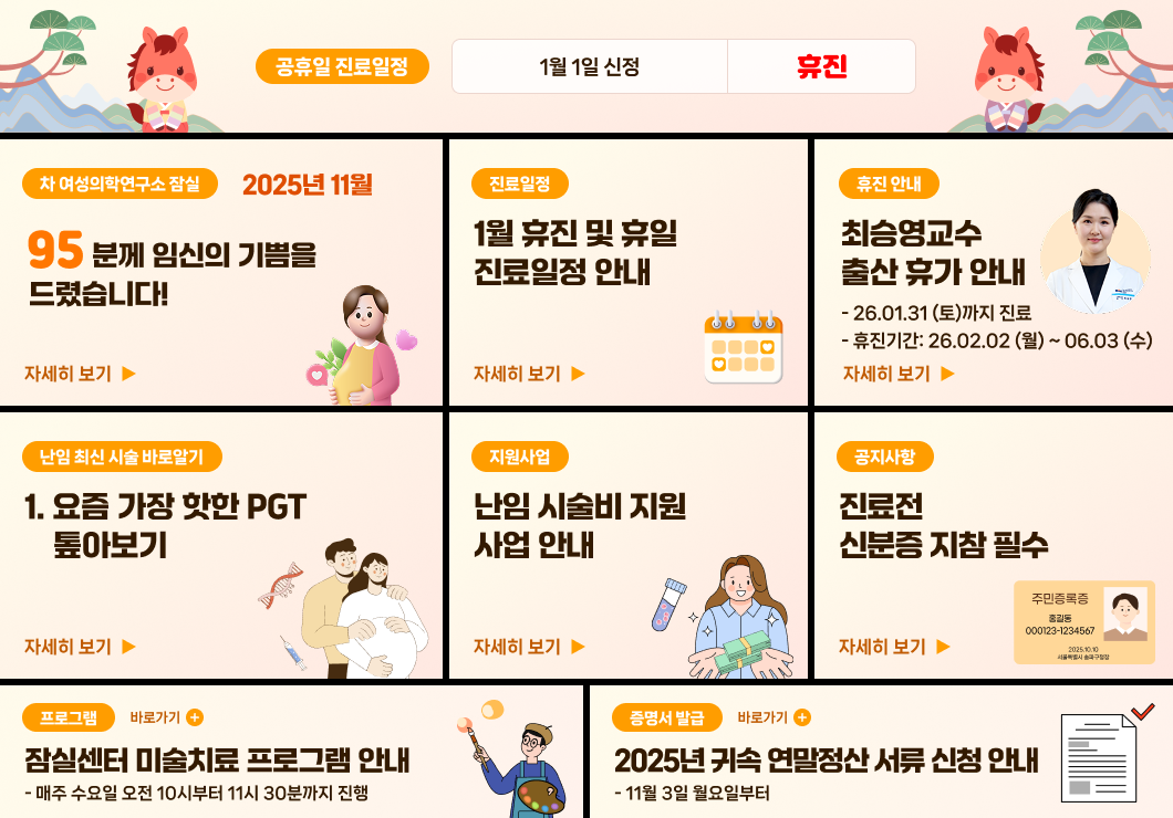 가임력 보존(난자/배아 동결), 난임 및 시험관 아기 시술, 인공수정, 자궁내막증, 다낭성 난소증후군, 불규칙 월경, 반복자연유산, 착상전 유전진단 (PGT), 조기난소기능부전, 자궁경수술, 외국인 진료